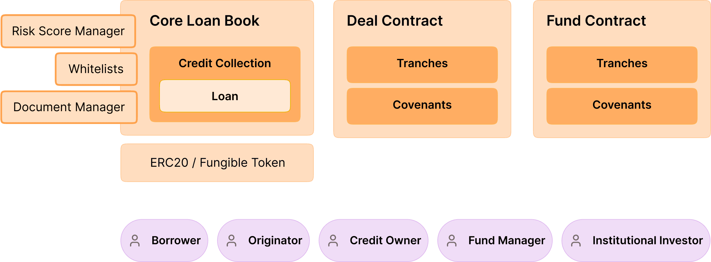 Fund Managers: Administrators of loan pools, managing tranches and investor returns. Managers can initiate coupon disbursements and operate within the bounds of covenants. Fund managers can approve/reject loans as collateral on a per-loan basis if enabled.