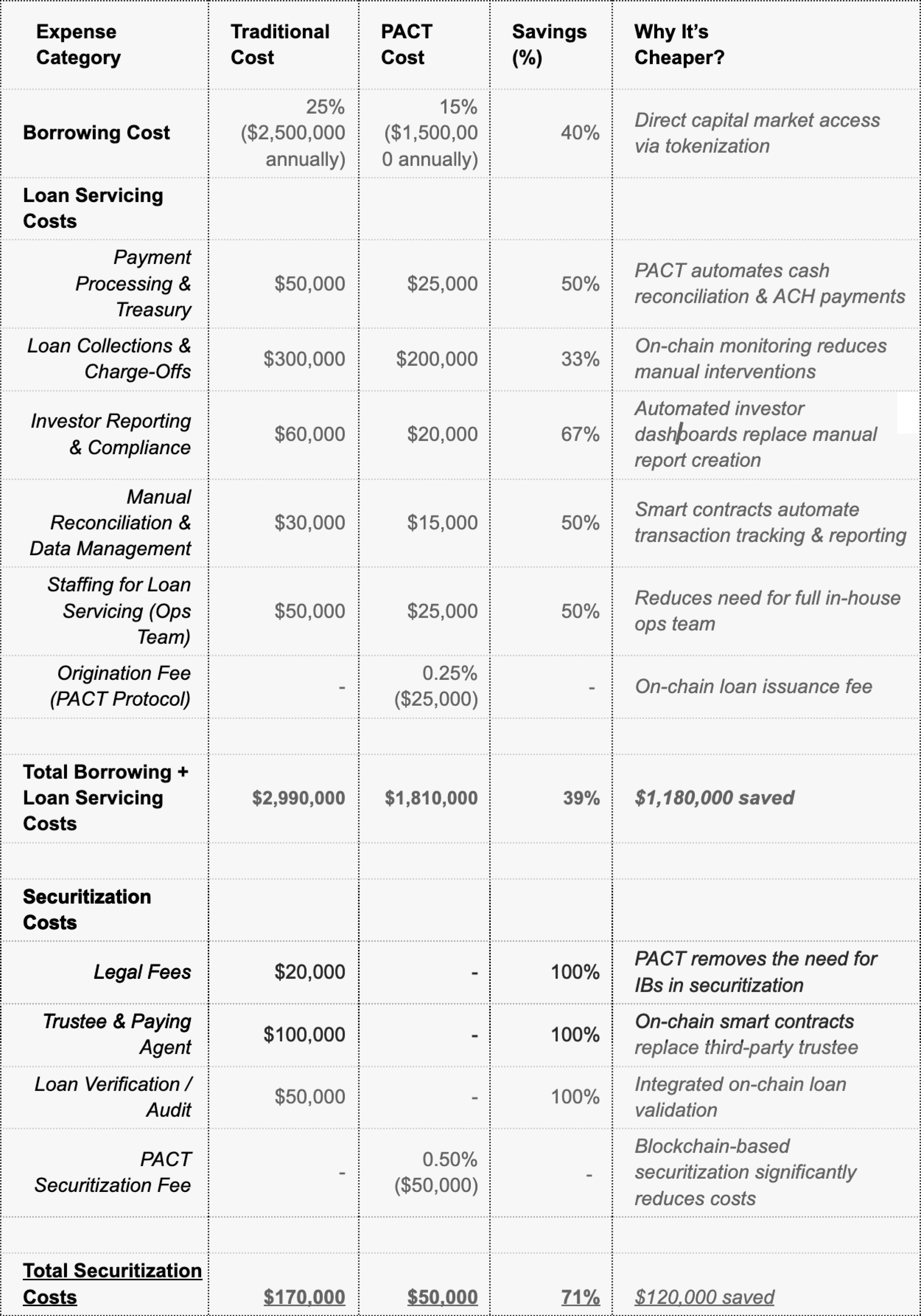 Without PACT, an originator needs investment banks, custodians, and verification agents, adding significant inefficiencies and high costs while limiting access to competitive funding sources.